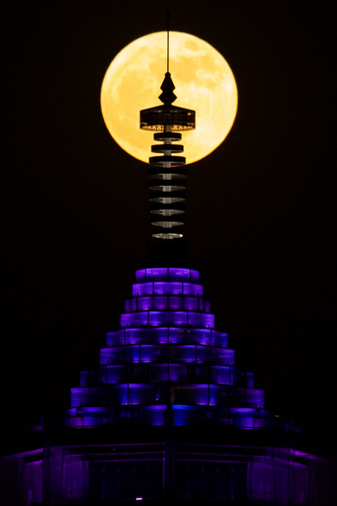 2022年6月14日,江蘇南京大報(bào)恩塔與“超級(jí)月亮”相映成景。新華社發(fā)(蘇陽 攝)