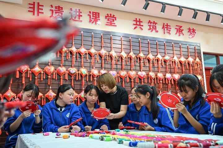 2025年9月26日,內(nèi)蒙古興安盟科右中旗巴彥呼舒第六中學(xué)美術(shù)教師、非遺代表性傳承人吳斯琴(左四)指導(dǎo)學(xué)生刺繡。近年來,內(nèi)蒙古興安盟科爾沁右翼中旗巴彥呼舒第六中學(xué)將當(dāng)?shù)貒?guó)家級(jí)非遺圖什業(yè)圖刺繡引入校園,開設(shè)校本課程,并成立興趣社團(tuán),在豐富校園文化生活的同時(shí),讓學(xué)生們近距離感受非遺的魅力,弘揚(yáng)和傳承中華優(yōu)秀傳統(tǒng)文化。