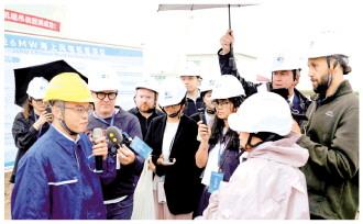 圖為9月19日,中外媒體記者在位于山東東營的26兆瓦級海上風力發(fā)電機組項目現(xiàn)場采訪。 新華社發(fā)
