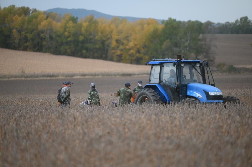 近日,引龍河農(nóng)場科技園區(qū)技術(shù)人員為試驗(yàn)種植的大豆品種進(jìn)行機(jī)械脫粒。(受訪者供圖)