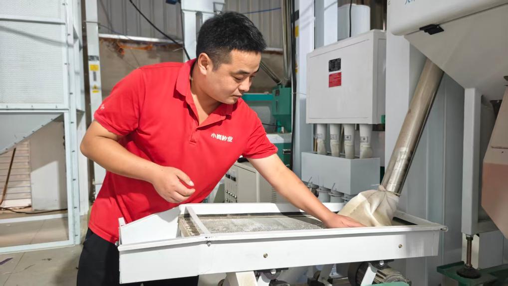 周地帥在新安裝的大米加工生產(chǎn)線前查看新加工的大米。新華社記者 陳諾 攝