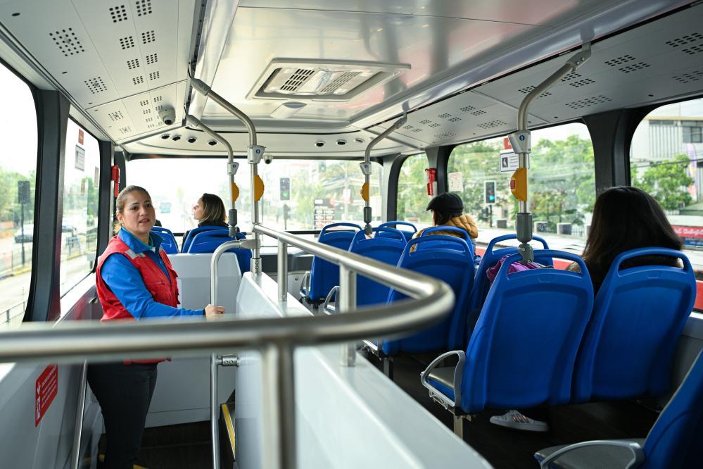 2023年11月2日,在智利首都圣地亞哥,一輛520路新能源公交車的工作人員在車內(nèi)巡視。智利圣地亞哥520路公交路線是為2023泛美運(yùn)動(dòng)會(huì)特別開設(shè)的。新華社記者辛悅衛(wèi)攝
