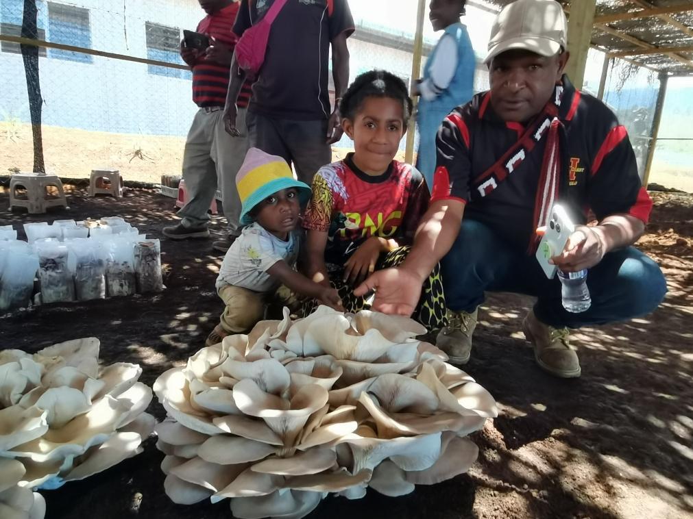 9月29日,在巴布亞新幾內(nèi)亞東高地省首府戈羅卡市,當(dāng)?shù)孛癖妳⒂^中國(guó)援巴布亞新幾內(nèi)亞菌草旱稻項(xiàng)目永久性示范基地種植的大平菇。新華社發(fā)(福建農(nóng)林大學(xué)國(guó)家菌草工程技術(shù)研究中心供圖)
