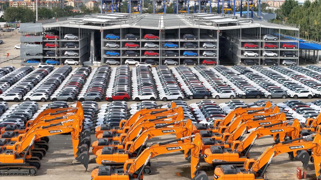 10月20日,國(guó)產(chǎn)汽車和工程機(jī)械在山東港口煙臺(tái)港集結(jié)等待裝船出口(無人機(jī)照片)。新華社發(fā)(唐克攝)