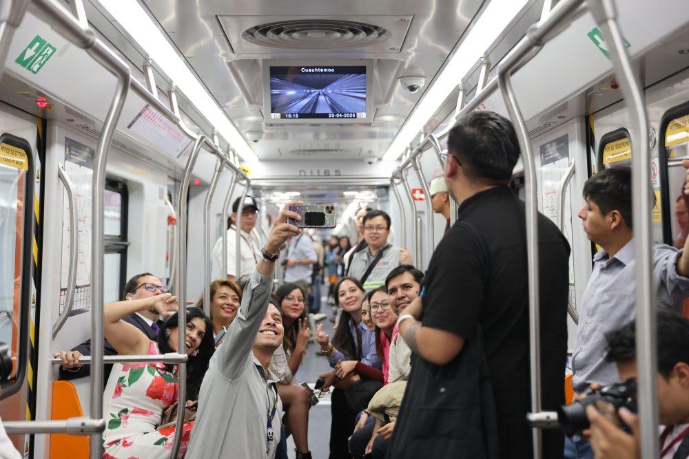 2025年4月23日,在墨西哥首都墨西哥城,媒體記者在地鐵新1號(hào)線列車(chē)上合影。當(dāng)日,墨西哥城地鐵新1號(hào)線舉行部分通車(chē)儀式,中國(guó)企業(yè)助力全面升級(jí)系統(tǒng)設(shè)備,改善市民通勤體驗(yàn)。