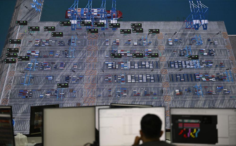 2025年5月16日,在秘魯錢(qián)凱港的中遠(yuǎn)海運(yùn)港口秘魯錢(qián)凱公司前方運(yùn)營(yíng)大樓,工作人員通過(guò)屏幕監(jiān)測(cè)港口運(yùn)行情況。錢(qián)凱港是中國(guó)與秘魯共建“一帶一路”標(biāo)志性項(xiàng)目,2024年11月正式開(kāi)港,成為連接亞洲與拉美最重要的航運(yùn)樞紐之一。