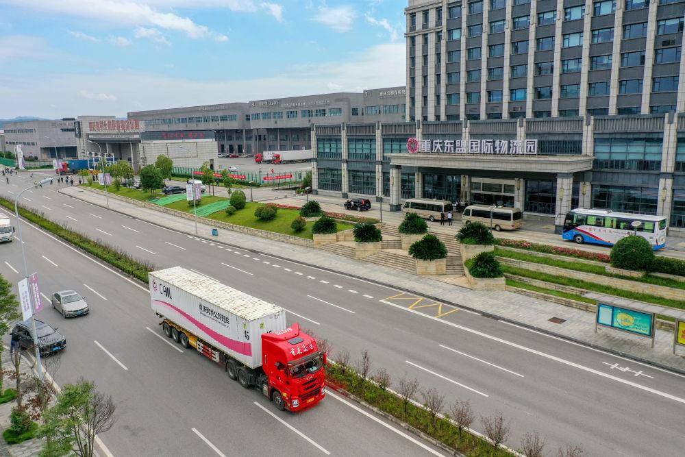 2023年10月11日,滿載筆記本電腦配件、發(fā)電機(jī)組件等產(chǎn)品的西部陸海新通道跨境公路班車(chē)從重慶南彭公路保稅物流中心駛出,途經(jīng)廣西憑祥,直達(dá)越南(無(wú)人機(jī)照片)。