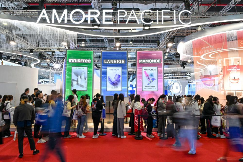 這是在上海舉行的第七屆中國(guó)國(guó)際進(jìn)口博覽會(huì)消費(fèi)品展區(qū)拍攝的愛(ài)茉莉太平洋展位(2024年11月7日)。韓國(guó)化妝品企業(yè)愛(ài)茉莉太平洋已連續(xù)七年參加進(jìn)博會(huì),為中國(guó)消費(fèi)者提供多元化產(chǎn)品。