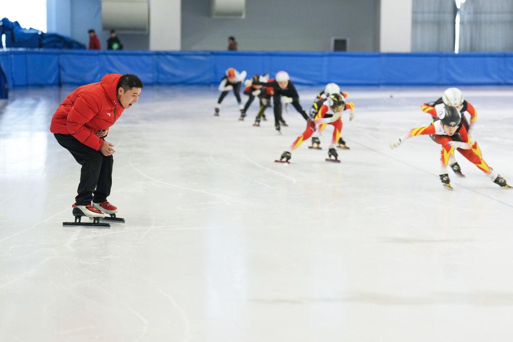2025年1月24日,短道速滑教練姚忠華(左)在黑龍江省七臺(tái)河市短道速滑館指導(dǎo)運(yùn)動(dòng)員進(jìn)行冰上訓(xùn)練。十余年來,姚忠華累計(jì)執(zhí)教培養(yǎng)過200余名運(yùn)動(dòng)員。七臺(tái)河市擁有“奧運(yùn)冠軍之城”的城市名片,在這里,教練員們一起筑夢冰場,為我國冰雪人才的儲(chǔ)備奉獻(xiàn)自己的力量。