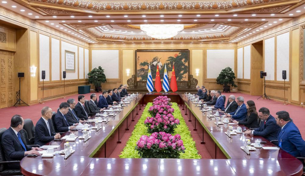 習(xí)近平指出,當(dāng)今世界正處于百年未有之大變局,國際形勢變亂交織,單邊霸凌愈演愈烈,中方支持烏拉圭接任“77國集團和中國”輪值主席國,愿與烏方加強全球南方團結(jié)協(xié)作,共同推進平等有序的世界多極化、普惠包容的經(jīng)濟全球化,攜手并進、共謀發(fā)展,為構(gòu)建人類命運共同體作出更大貢獻。中方始終重視中拉關(guān)系,支持拉美和加勒比國家維護自身主權(quán)、安全、發(fā)展利益,支持烏拉圭接任拉美和加勒比國家共同體以及南方共同市場輪值主席國,愿同烏方和地區(qū)國家推動共建中拉命運共同體走深走實。