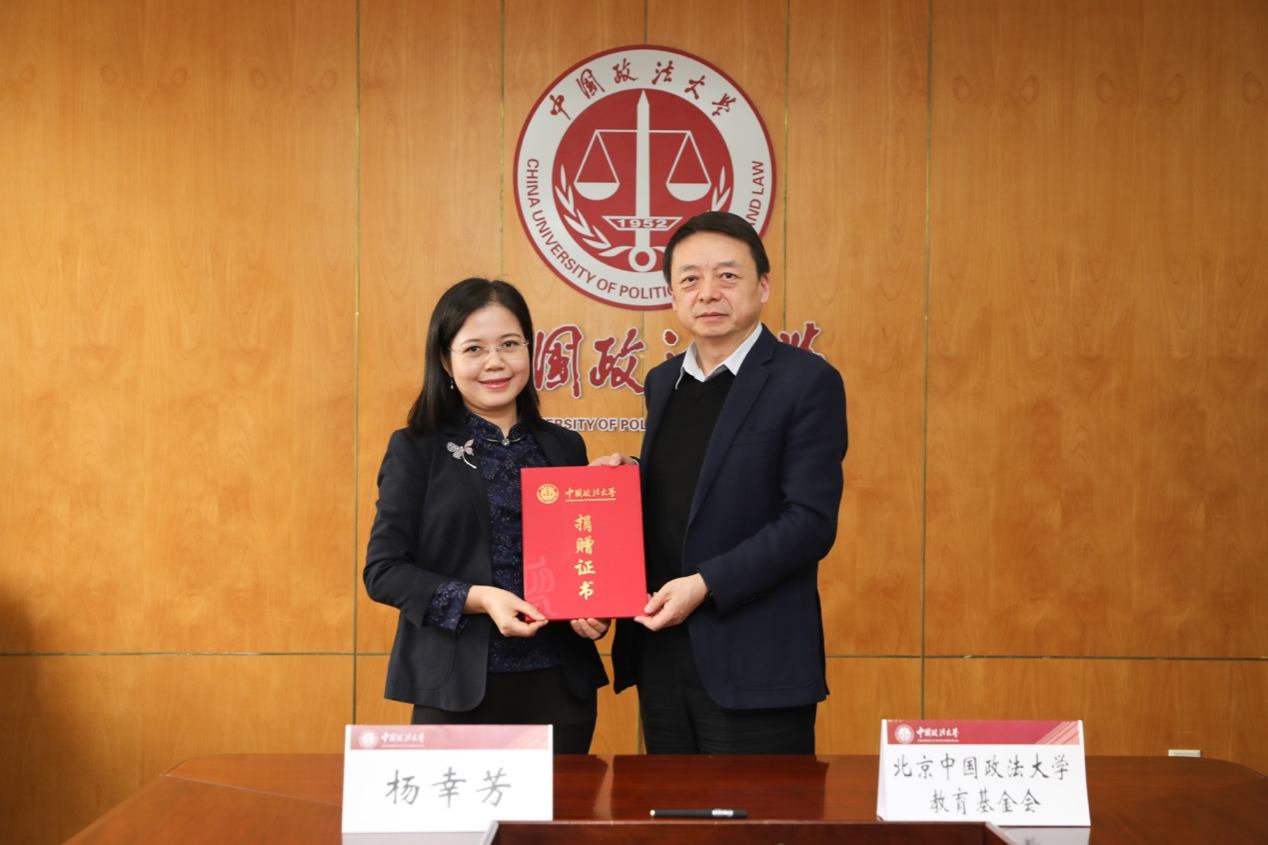盧春龍代表中國政法大學(xué)和楊幸芳簽署捐贈協(xié)議,馬懷德代表中國政法大學(xué)向楊幸芳頒發(fā)捐贈證書。