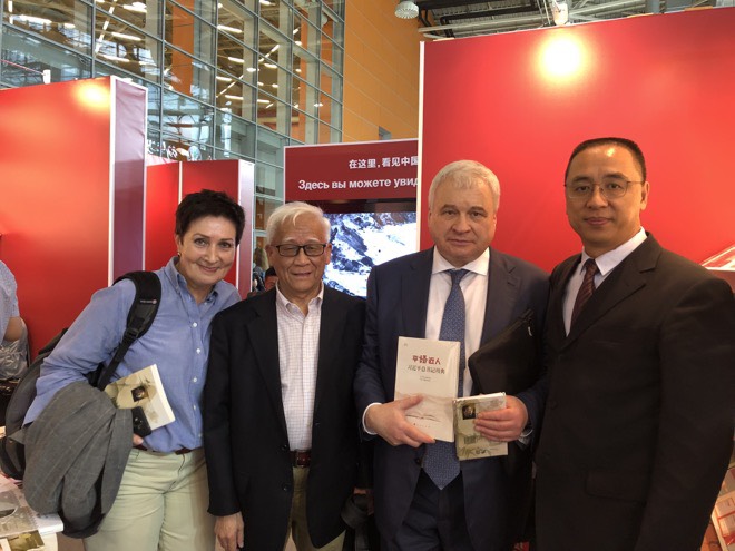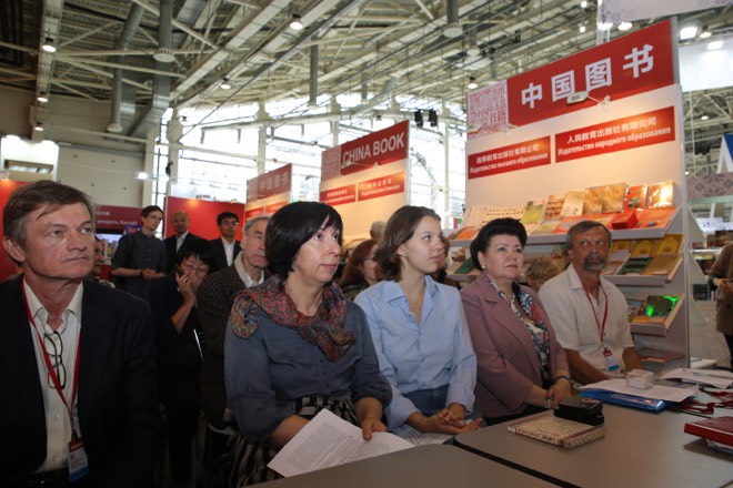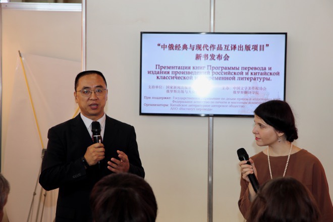 杰尼索夫大使在隨后的致辭中說:“上周,我和格里高利耶夫夫(俄羅斯出版與大眾傳媒署副署長)剛剛出席在北京俄羅斯文化中心舉辦的《普京:權(quán)力的邏輯》中文版首發(fā)式,今天在莫斯科書展再次出席非常高興?!爸卸砘プg出版項目”是兩國最重要的人文合作項目之一,俄羅斯外交部、俄羅斯大使館都非常支持。我認為,中俄兩國所有領(lǐng)域的合作中最重要的是人文領(lǐng)域,尤其是圖書出版和文學翻譯。我作為俄羅斯駐華大使,能親身感受到中國年輕人對俄羅斯文學的濃厚興趣,我也希望,俄羅斯年輕人也能喜歡中國文學。俄羅斯文學的中國翻譯家和中國文學的俄羅斯翻譯家都是偉大的人物,我們應(yīng)該為他們樹立豐碑,書展就是這樣的豐碑。希望“中俄互譯出版項目”今后能夠出版200部、300部甚至更多的成果!”