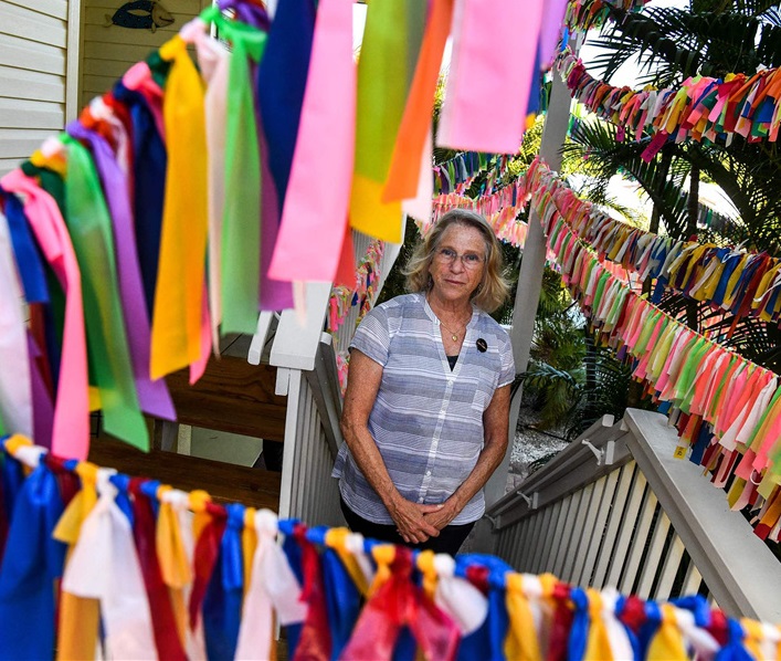 人民網(wǎng)訊 據(jù)媒體3月10日報道,美國佛羅里達(dá)州安娜瑪麗亞島,67歲的凱西·托拜厄斯(Cathy Tobias)在院子里系上絲帶,紀(jì)念新冠肺炎遇難者。現(xiàn)在她的院子里有超過3萬條絲帶,從露臺、樓梯到陽臺都系滿了五顏六色的帶子,每一條代表著一位死于新冠肺炎的佛州人。