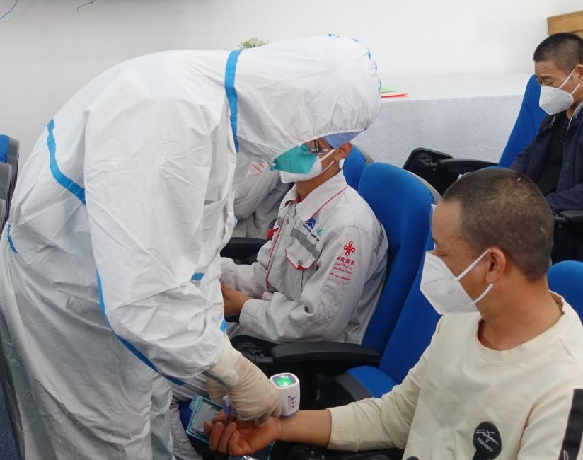 4月14日,在突尼斯首都突尼斯市,工作人員為一名準(zhǔn)備接種新冠疫苗的中國(guó)公民檢查體溫。