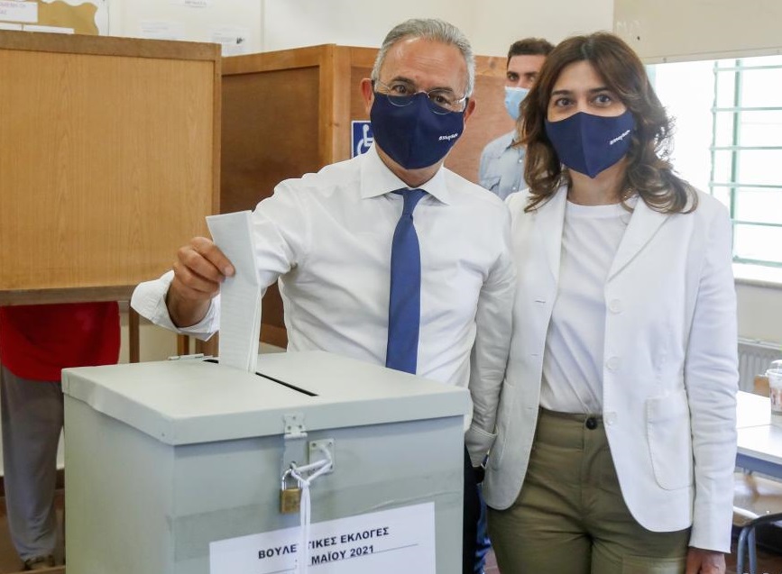 5月30日,塞浦路斯民主大會黨領(lǐng)導(dǎo)人、候選人內(nèi)奧菲圖(左)在首都尼科西亞的一處投票站投票。