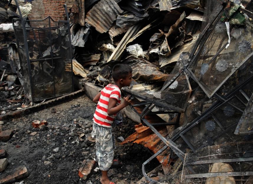 6月7日,一名兒童在孟加拉國首都達(dá)卡發(fā)生火災(zāi)的貧民窟廢墟中尋找個(gè)人物品。