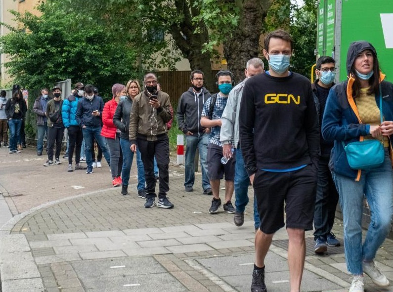 6月19日,人們?cè)谟?guó)倫敦一家新冠疫苗接種中心外排隊(duì)。