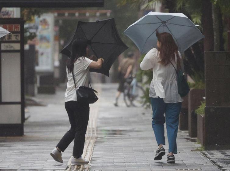 2024年8月29日,行人在強(qiáng)風(fēng)中走在日本鹿兒島縣鹿兒島市街頭。新華社/共同社