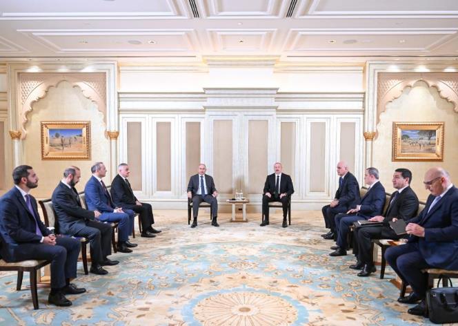 7月10日,阿塞拜疆總統(tǒng)阿利耶夫(右)和亞美尼亞總理帕什尼揚(yáng)在阿聯(lián)酋首都阿布扎比舉行會談,重申將繼續(xù)通過直接對話推動(dòng)雙邊關(guān)系正?;?。新華社/阿新社