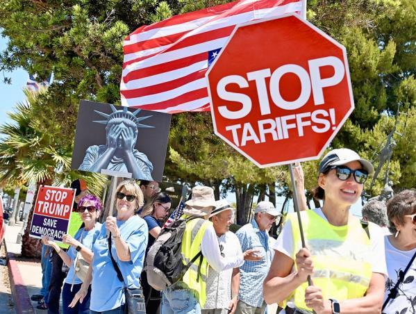 圖為美國(guó)民眾在洛杉磯港抗議特朗普關(guān)稅政策。 CFP供圖
