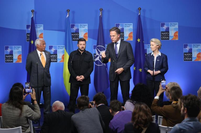 6月24日,在荷蘭海牙,歐洲理事會主席科斯塔、烏克蘭總統(tǒng)澤連斯基、北約秘書長呂特和歐盟委員會主席馮德萊恩(從左至右)在北約峰會期間共見記者。新華社記者 趙丁喆 攝