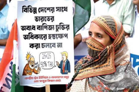 圖為8月13日,印度加爾各答,印度中央工會(huì)組織成員舉行抗議集會(huì),反對(duì)美國政府對(duì)印度商品征收50%的關(guān)稅。 CFP供圖