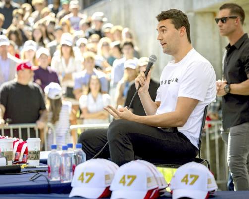 圖為9月10日,查理·柯克在美國(guó)猶他州奧勒姆市的猶他山谷大學(xué)遭槍擊前發(fā)表演講。 新華社發(fā)