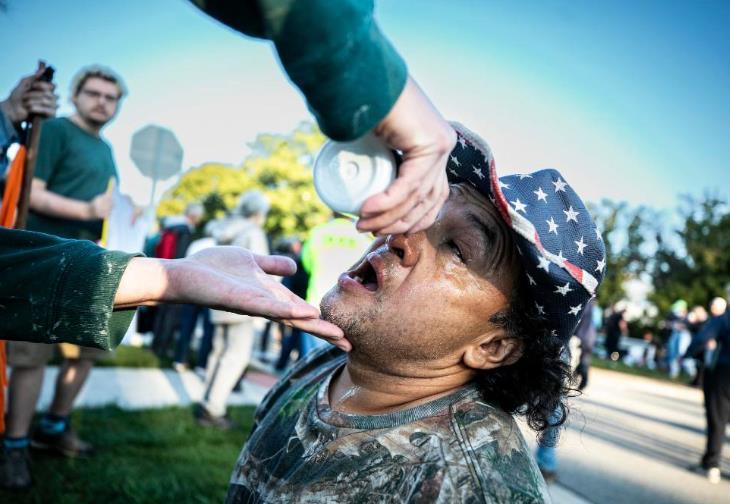 9月26日,在位于美國芝加哥西郊布羅德維尤市的移民與海關(guān)執(zhí)法局辦事機(jī)構(gòu)外,執(zhí)法人員發(fā)射的催淚彈傷及一名抗議者,同伴在為他進(jìn)行緊急處置。新華社發(fā)(文森特·約翰遜攝)
