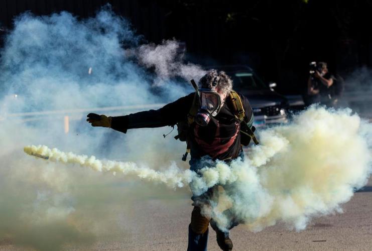 9月26日,在位于美國芝加哥西郊布羅德維尤市的移民與海關(guān)執(zhí)法局辦事機(jī)構(gòu)外,抗議者在沖突中將執(zhí)法人員發(fā)射的催淚彈瓶扔回。新華社發(fā)(文森特·約翰遜攝)