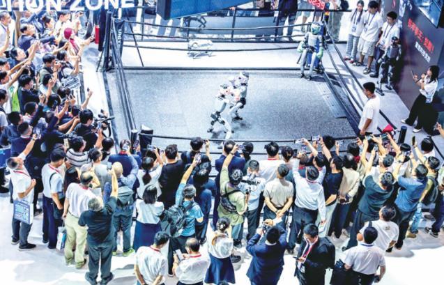 圖為9月25日,在第四屆全球數(shù)字貿(mào)易博覽會(huì)數(shù)智未來主題展區(qū)的杭州六小龍專區(qū),觀眾觀看宇樹科技的人形機(jī)器人進(jìn)行格斗擂臺(tái)賽。 新華社發(fā)