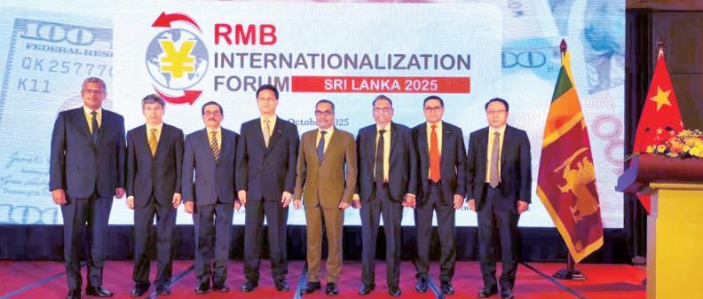 圖為10月29日,中國(guó)駐斯里蘭卡大使戚振宏(左四)出席在斯里蘭卡首都科倫坡舉辦的人民幣論壇。