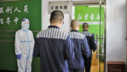 圖為鄧甲龍(左一)組織罪犯購(gòu)書。 受訪者供圖