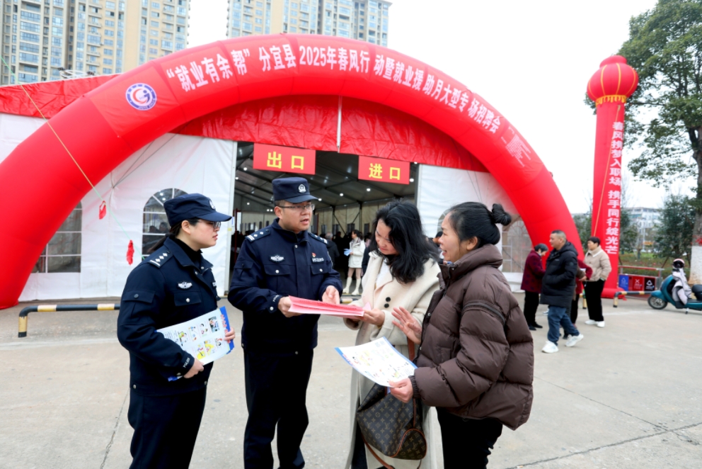 近日,江西省分宜縣公安局利用新春招聘會的有利契機(jī),組織民輔警開展“促進(jìn)就業(yè) 反詐同行”普法宣傳活動,通過發(fā)放宣傳單、案例講解、交流互動等方式,向求職的群眾講解電信網(wǎng)絡(luò)詐騙防范技巧,為應(yīng)聘者上好求職防騙“第一課”。