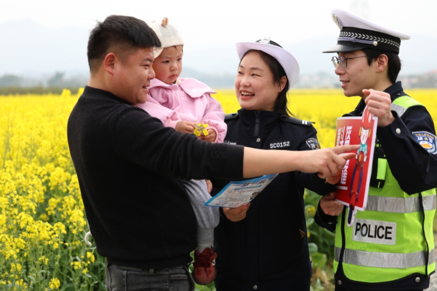 3月11日,江西省吉安市遂川縣舉辦以“花海遂川·美麗田園·共赴春日盛宴”為主題的油菜花賞花季活動。遂川縣公安局交警大隊全力維護沿線道路交通秩序,并組織民輔警走進花海,向游客宣傳交通安全法律法規(guī)。