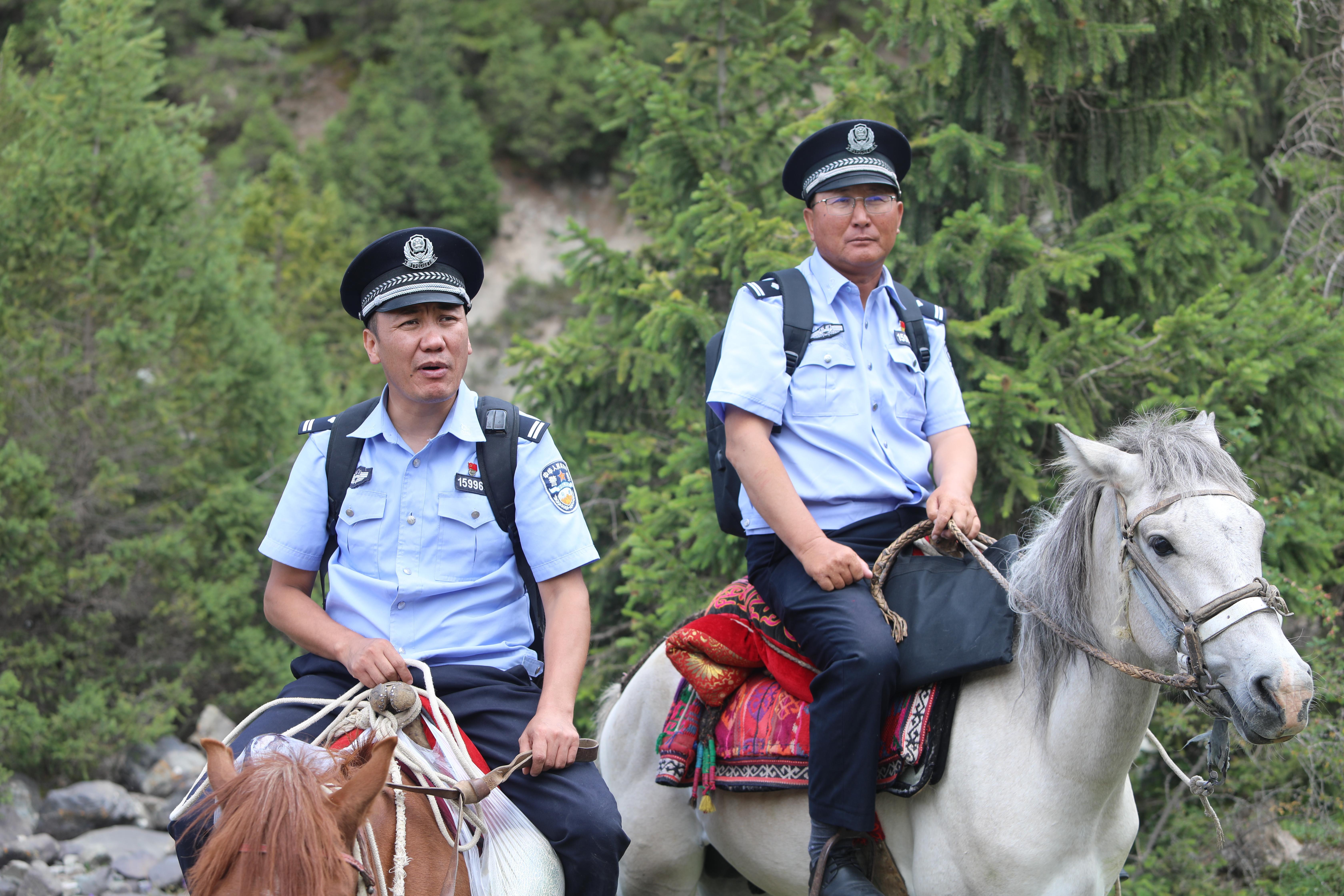 這是烏恰縣公安局波斯坦鐵列克鄉(xiāng)派出所的“馬背警務服務隊”,民警李鑫林和同事加庫普瓦力·拜克堯力正帶著辦好的證件,送往牧民家中。喬爾波村牧區(qū)面積大,部分區(qū)域車輛難以抵達,馬匹成了最可靠的交通工具。