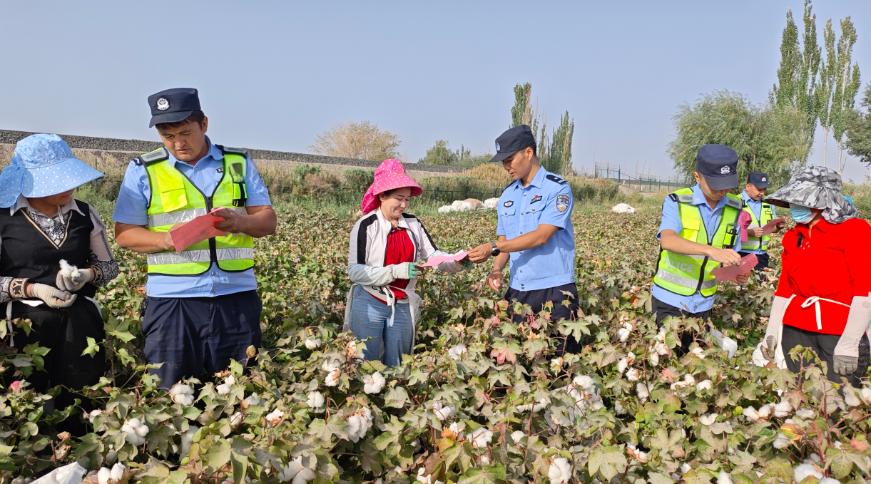 圖為9月22日,巴楚站派出所民警向轄區(qū)鐵路周邊棉田的棉農(nóng)開(kāi)展普法宣傳。