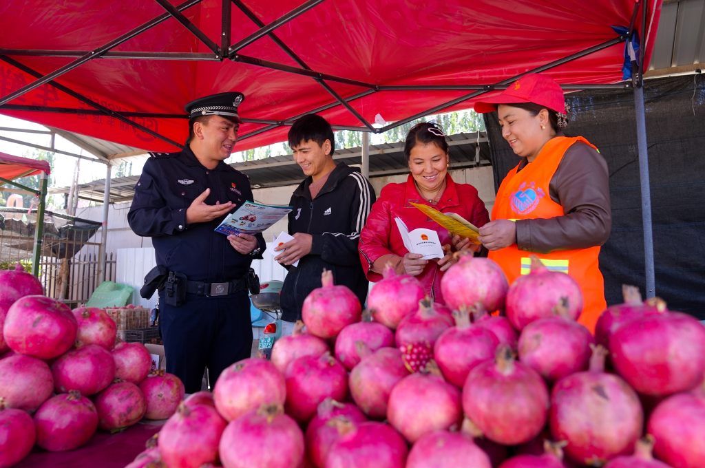 10月12日,新疆維吾爾自治區(qū)葉城縣伯西熱克鎮(zhèn)派出所深入踐行新時代“楓橋經(jīng)驗(yàn)”,組織“石榴大媽”“石榴義警”等走進(jìn)轄區(qū)石榴園區(qū)、流動擺攤路段、合作社及打包點(diǎn)等地,開展常態(tài)化巡邏防控、安全隱患排查、安防普法宣傳和矛盾糾紛調(diào)處工作。民警與義警向群眾講解防盜防騙、交通安全等知識,及時掌握社情民意,化解潛在風(fēng)險,用實(shí)際行動守護(hù)群眾生命財(cái)產(chǎn)安全。