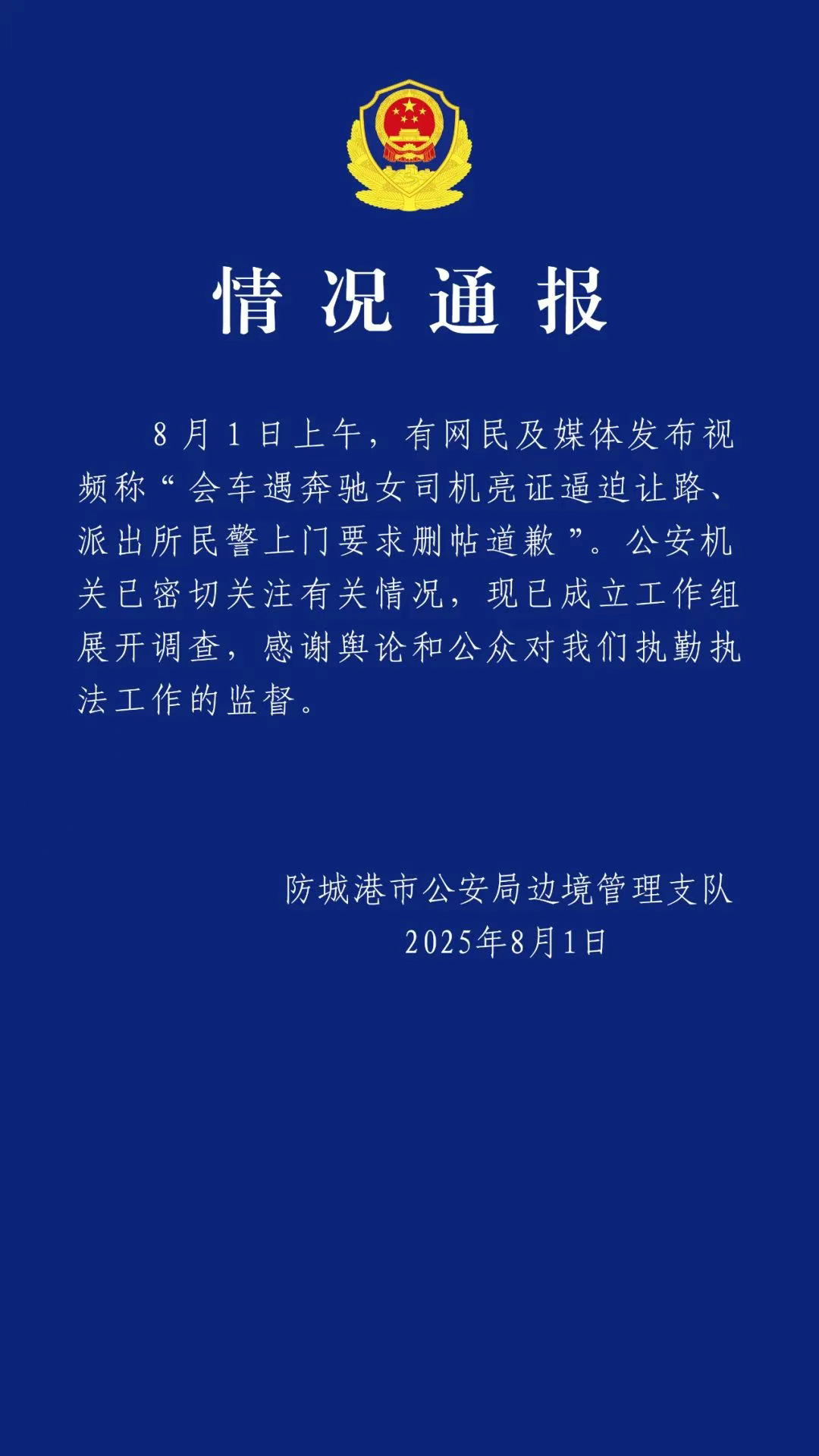 8月1日晚,防城港市公安局邊境管理支隊(duì)發(fā)布情況通報(bào):8月1日上午,有網(wǎng)民及媒體發(fā)布視頻稱“會(huì)車遇奔馳女司機(jī)亮證逼迫讓路、派出所民警上門要求刪帖道歉”。公安機(jī)關(guān)已密切關(guān)注有關(guān)情況,現(xiàn)已成立工作組展開(kāi)調(diào)查,感謝輿論和公眾對(duì)我們執(zhí)勤執(zhí)法工作的監(jiān)督。