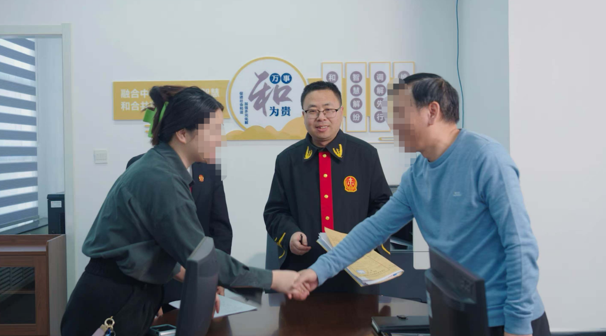 圖為中國(新疆)自由貿(mào)易試驗區(qū)烏魯木齊片區(qū)法庭化解一起買賣合同糾紛,當事人雙方握手言和。通訊員 王雅楠 攝