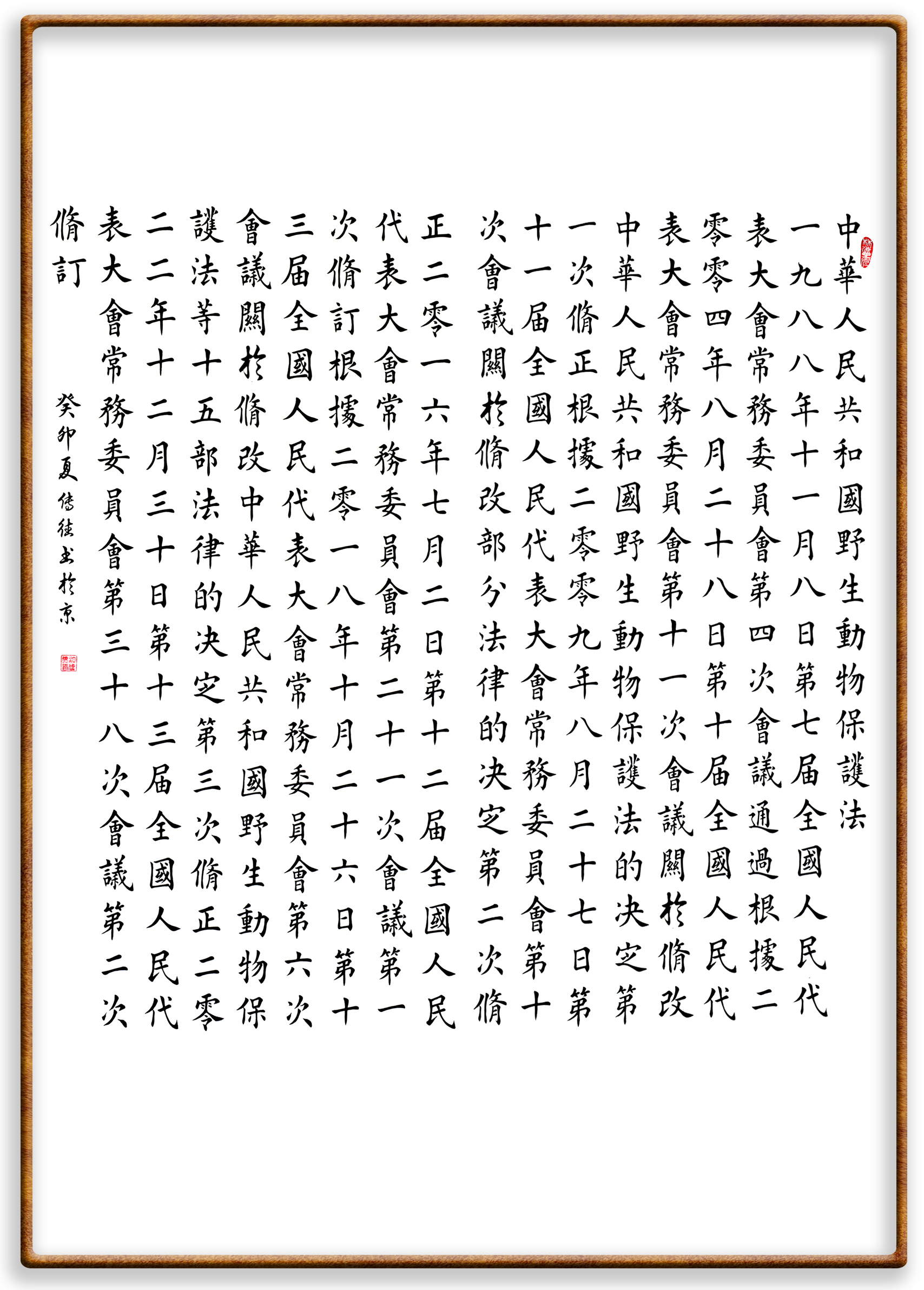 野生動(dòng)物保護(hù)法修訂歷程 (1988年11月8日第七屆全國(guó)人民代表大會(huì)常務(wù)委員會(huì)第四次會(huì)議通過(guò) 根據(jù)2004年8月28日第十屆全國(guó)人民代表大會(huì)常務(wù)委員會(huì)第十一次會(huì)議《關(guān)于修改〈中華人民共和國(guó)野生動(dòng)物保護(hù)法〉的決定》第一次修正 根據(jù)2009年8月27日第十一屆全國(guó)人民代表大會(huì)常務(wù)委員會(huì)第十次會(huì)議《關(guān)于修改部分法律的決定》第二次修正 2016年7月2日第十二屆全國(guó)人民代表大會(huì)常務(wù)委員會(huì)第二十一次會(huì)議第一次修訂 根據(jù)2018年10月26日第十三屆全國(guó)人民代表大會(huì)常務(wù)委員會(huì)第六次會(huì)議《關(guān)于修改〈中華人民共和國(guó)野生動(dòng)物保護(hù)法〉等十五部法律的決定》第三次修正 2022年12月30日第十三屆全國(guó)人民代表大會(huì)常務(wù)委員會(huì)第三十八次會(huì)議第二次修訂)