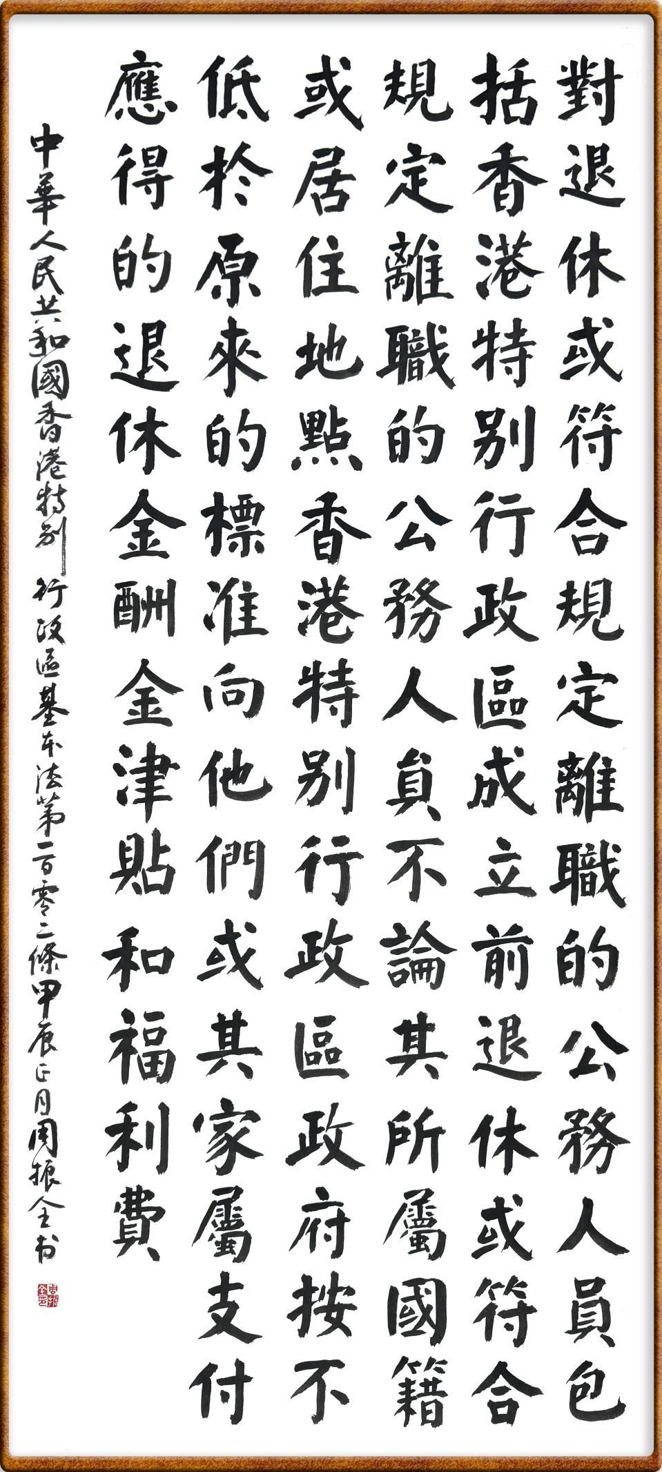 香港基本法第一百零二條 對退休或符合規(guī)定離職的公務人員,包括香港特別行政區(qū)成立前退休或符合規(guī)定離職的公務人員,不論其所屬國籍或居住地點,香港特別行政區(qū)政府按不低于原來的標準向他們或其家屬支付應得的退休金、酬金、津貼和福利費。