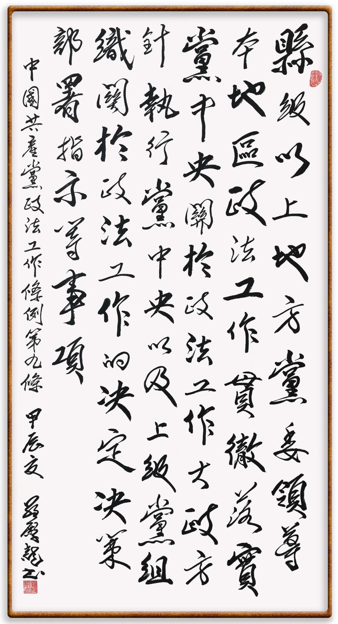 《中國共產(chǎn)黨政法工作條例》對黨領(lǐng)導新時代政法工作進行全面制度擘畫,為黨領(lǐng)導政法工作提供基本遵循,具有重大而深遠的意義。為學習好、宣傳好、貫徹好、實施好這部黨內(nèi)法規(guī),繼《中華人民共和國民法典》《中華人民共和國憲法》《信訪工作條例》《中華人民共和國澳門特別行政區(qū)基本法》《中華人民共和國香港特別行政區(qū)基本法》等法律法規(guī)之后,“書·法”系列活動將筆端對準《中國共產(chǎn)黨政法工作條例》。