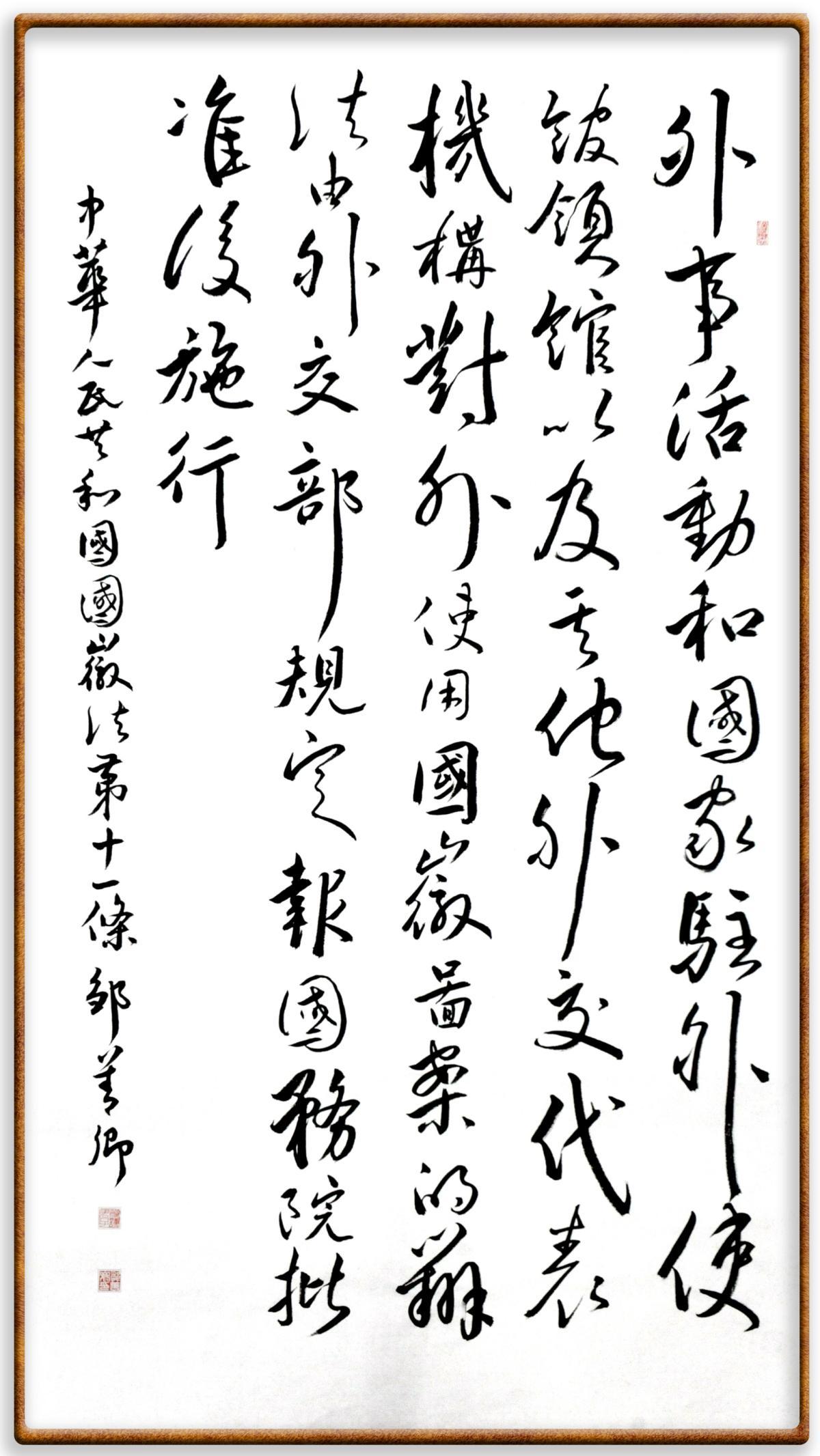 國徽法第十一條 外事活動和國家駐外使館、領(lǐng)館以及其他外交代表機構(gòu)對外使用國徽圖案的辦法,由外交部規(guī)定,報國務(wù)院批準后施行。