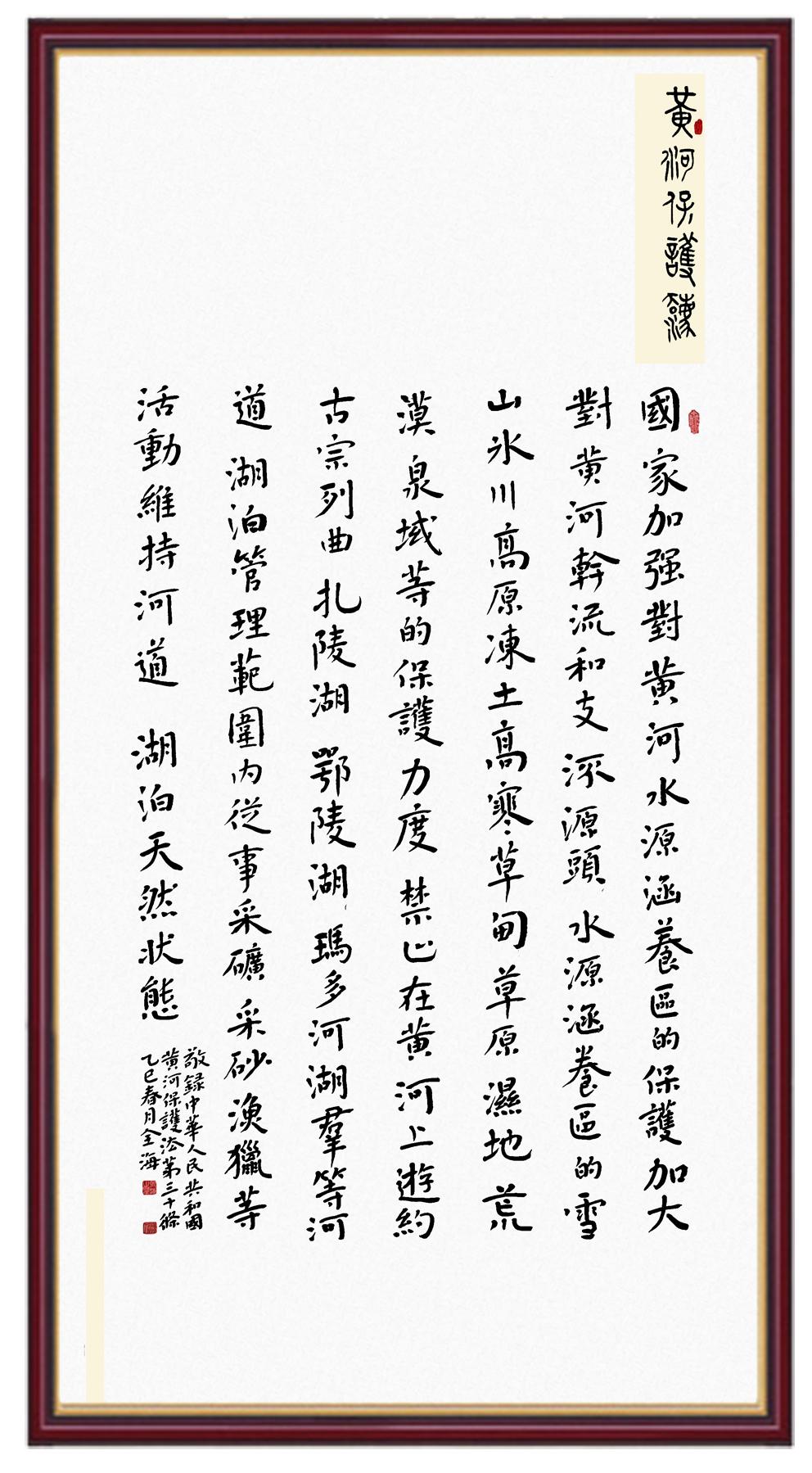 黃河寧,天下平。黃河是中華民族的發(fā)源地和搖籃,保護(hù)黃河是事關(guān)中華民族偉大復(fù)興的千秋大計(jì)。《中華人民共和國(guó)黃河保護(hù)法》為推進(jìn)水資源節(jié)約集約利用、保護(hù)傳承弘揚(yáng)黃河文化、推動(dòng)黃河流域生態(tài)保護(hù)和高質(zhì)量發(fā)展提供了有力法治保障。繼書寫《中華人民共和國(guó)民法典》《中華人民共和國(guó)憲法》《中華人民共和國(guó)澳門特別行政區(qū)基本法》《中華人民共和國(guó)香港特別行政區(qū)基本法》《中華人民共和國(guó)國(guó)旗法》《中華人民共和國(guó)國(guó)徽法》《中華人民共和國(guó)國(guó)歌法》《中華人民共和國(guó)法官法》等法律法規(guī)之后,法制日?qǐng)?bào)社聯(lián)合沿黃九?。▍^(qū))司法廳、書法家協(xié)會(huì),將筆端對(duì)準(zhǔn)《中華人民共和國(guó)黃河保護(hù)法》。