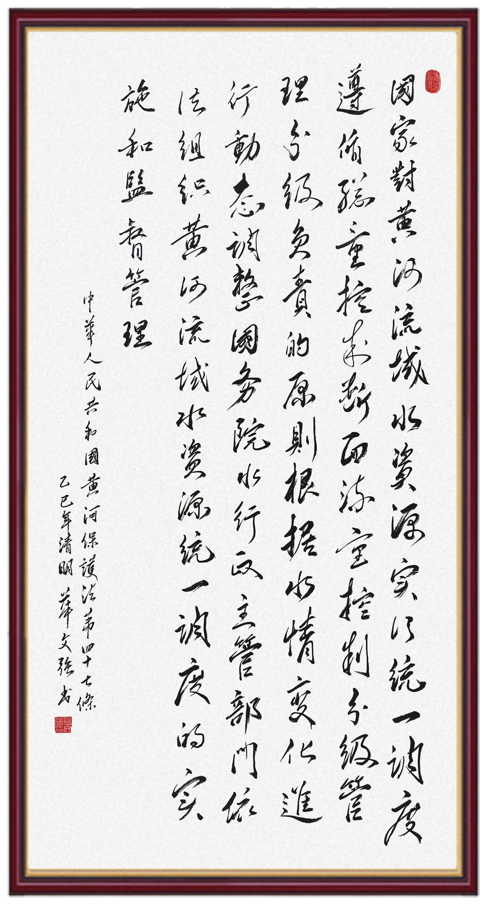 黃河寧,天下平。黃河是中華民族的發(fā)源地和搖籃,保護黃河是事關(guān)中華民族偉大復(fù)興的千秋大計?!吨腥A人民共和國黃河保護法》為推進水資源節(jié)約集約利用、保護傳承弘揚黃河文化、推動黃河流域生態(tài)保護和高質(zhì)量發(fā)展提供了有力法治保障。繼書寫《中華人民共和國民法典》《中華人民共和國憲法》《中華人民共和國澳門特別行政區(qū)基本法》《中華人民共和國香港特別行政區(qū)基本法》《中華人民共和國國旗法》《中華人民共和國國徽法》《中華人民共和國國歌法》《中華人民共和國法官法》等法律法規(guī)之后,法制日報社聯(lián)合沿黃九?。▍^(qū))司法廳、書法家協(xié)會,將筆端對準《中華人民共和國黃河保護法》。