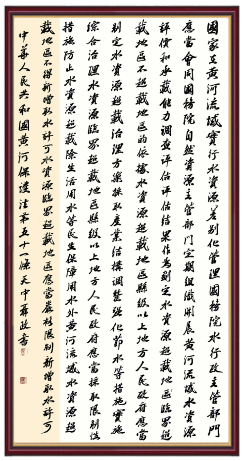黃河寧,天下平。黃河是中華民族的發(fā)源地和搖籃,保護(hù)黃河是事關(guān)中華民族偉大復(fù)興的千秋大計?!吨腥A人民共和國黃河保護(hù)法》為推進(jìn)水資源節(jié)約集約利用、保護(hù)傳承弘揚(yáng)黃河文化、推動黃河流域生態(tài)保護(hù)和高質(zhì)量發(fā)展提供了有力法治保障。繼書寫《中華人民共和國民法典》《中華人民共和國憲法》《中華人民共和國澳門特別行政區(qū)基本法》《中華人民共和國香港特別行政區(qū)基本法》《中華人民共和國國旗法》《中華人民共和國國徽法》《中華人民共和國國歌法》《中華人民共和國法官法》等法律法規(guī)之后,法制日報社聯(lián)合沿黃九?。▍^(qū))司法廳、書法家協(xié)會,將筆端對準(zhǔn)《中華人民共和國黃河保護(hù)法》。