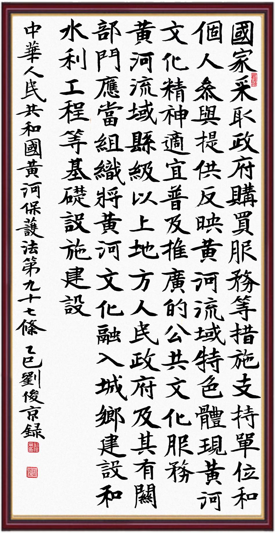 黃河寧,天下平。黃河是中華民族的發(fā)源地和搖籃,保護黃河是事關中華民族偉大復興的千秋大計?!吨腥A人民共和國黃河保護法》為推進水資源節(jié)約集約利用、保護傳承弘揚黃河文化、推動黃河流域生態(tài)保護和高質量發(fā)展提供了有力法治保障。繼書寫《中華人民共和國民法典》《中華人民共和國憲法》《中華人民共和國澳門特別行政區(qū)基本法》《中華人民共和國香港特別行政區(qū)基本法》《中華人民共和國國旗法》《中華人民共和國國徽法》《中華人民共和國國歌法》《中華人民共和國法官法》等法律法規(guī)之后,法制日報社聯合沿黃九?。▍^(qū))司法廳、書法家協(xié)會,將筆端對準《中華人民共和國黃河保護法》。