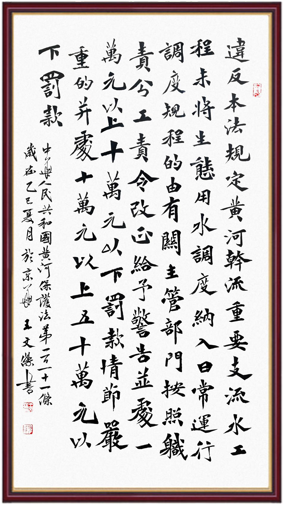 黃河寧,天下平。黃河是中華民族的發(fā)源地和搖籃,保護(hù)黃河是事關(guān)中華民族偉大復(fù)興的千秋大計(jì)?!吨腥A人民共和國(guó)黃河保護(hù)法》為推進(jìn)水資源節(jié)約集約利用、保護(hù)傳承弘揚(yáng)黃河文化、推動(dòng)黃河流域生態(tài)保護(hù)和高質(zhì)量發(fā)展提供了有力法治保障。繼書寫《中華人民共和國(guó)民法典》《中華人民共和國(guó)憲法》《中華人民共和國(guó)澳門特別行政區(qū)基本法》《中華人民共和國(guó)香港特別行政區(qū)基本法》《中華人民共和國(guó)國(guó)旗法》《中華人民共和國(guó)國(guó)徽法》《中華人民共和國(guó)國(guó)歌法》《中華人民共和國(guó)法官法》等法律法規(guī)之后,法制日?qǐng)?bào)社聯(lián)合沿黃九?。▍^(qū))司法廳、書法家協(xié)會(huì),將筆端對(duì)準(zhǔn)《中華人民共和國(guó)黃河保護(hù)法》。
