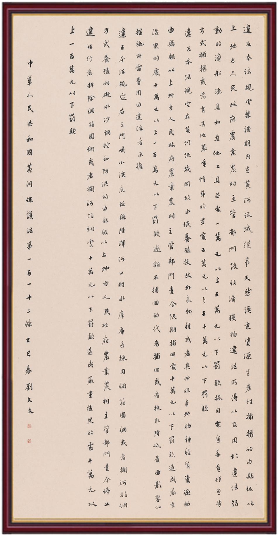 黃河寧,天下平。黃河是中華民族的發(fā)源地和搖籃,保護(hù)黃河是事關(guān)中華民族偉大復(fù)興的千秋大計(jì)?!吨腥A人民共和國(guó)黃河保護(hù)法》為推進(jìn)水資源節(jié)約集約利用、保護(hù)傳承弘揚(yáng)黃河文化、推動(dòng)黃河流域生態(tài)保護(hù)和高質(zhì)量發(fā)展提供了有力法治保障。繼書(shū)寫《中華人民共和國(guó)民法典》《中華人民共和國(guó)憲法》《中華人民共和國(guó)澳門特別行政區(qū)基本法》《中華人民共和國(guó)香港特別行政區(qū)基本法》《中華人民共和國(guó)國(guó)旗法》《中華人民共和國(guó)國(guó)徽法》《中華人民共和國(guó)國(guó)歌法》《中華人民共和國(guó)法官法》等法律法規(guī)之后,法制日?qǐng)?bào)社聯(lián)合沿黃九省(區(qū))司法廳、書(shū)法家協(xié)會(huì),將筆端對(duì)準(zhǔn)《中華人民共和國(guó)黃河保護(hù)法》。