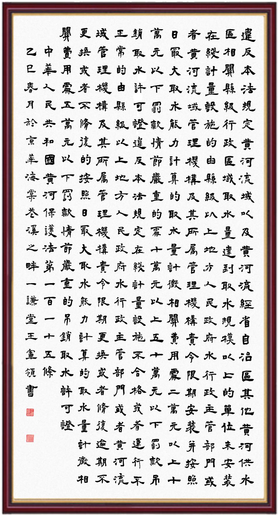 黃河寧,天下平。黃河是中華民族的發(fā)源地和搖籃,保護黃河是事關(guān)中華民族偉大復(fù)興的千秋大計?!吨腥A人民共和國黃河保護法》為推進水資源節(jié)約集約利用、保護傳承弘揚黃河文化、推動黃河流域生態(tài)保護和高質(zhì)量發(fā)展提供了有力法治保障。繼書寫《中華人民共和國民法典》《中華人民共和國憲法》《中華人民共和國澳門特別行政區(qū)基本法》《中華人民共和國香港特別行政區(qū)基本法》《中華人民共和國國旗法》《中華人民共和國國徽法》《中華人民共和國國歌法》《中華人民共和國法官法》等法律法規(guī)之后,法制日報社聯(lián)合沿黃九?。▍^(qū))司法廳、書法家協(xié)會,將筆端對準《中華人民共和國黃河保護法》。